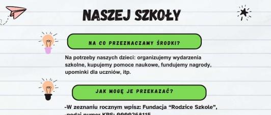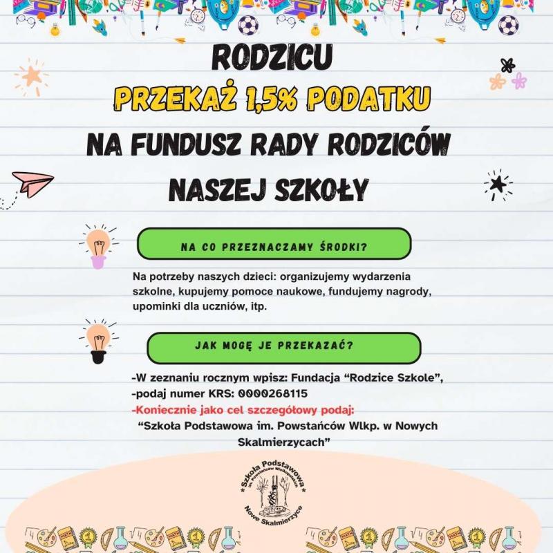 1,5% niby niewiele a radości co niemiara! Wystarczy w PIT wpisać nr KRS 0000268115, cel szczegółowy: Szkoła Podstawowa im. Powstańców Wielkopolskich w Nowych Skalmierzycach.